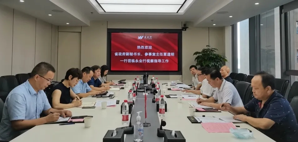 2021年9月26日,湖北省政府副秘书长、参事室主任覃道明一行莅临永业行调研指导工作。省政府办公厅参事室参事业务处副处长、三级调研员熊世民、组织联络处副处长陈立军、参事业务处一级调研员李修松、参事馆员联络处副处长杨云林陪同调研。